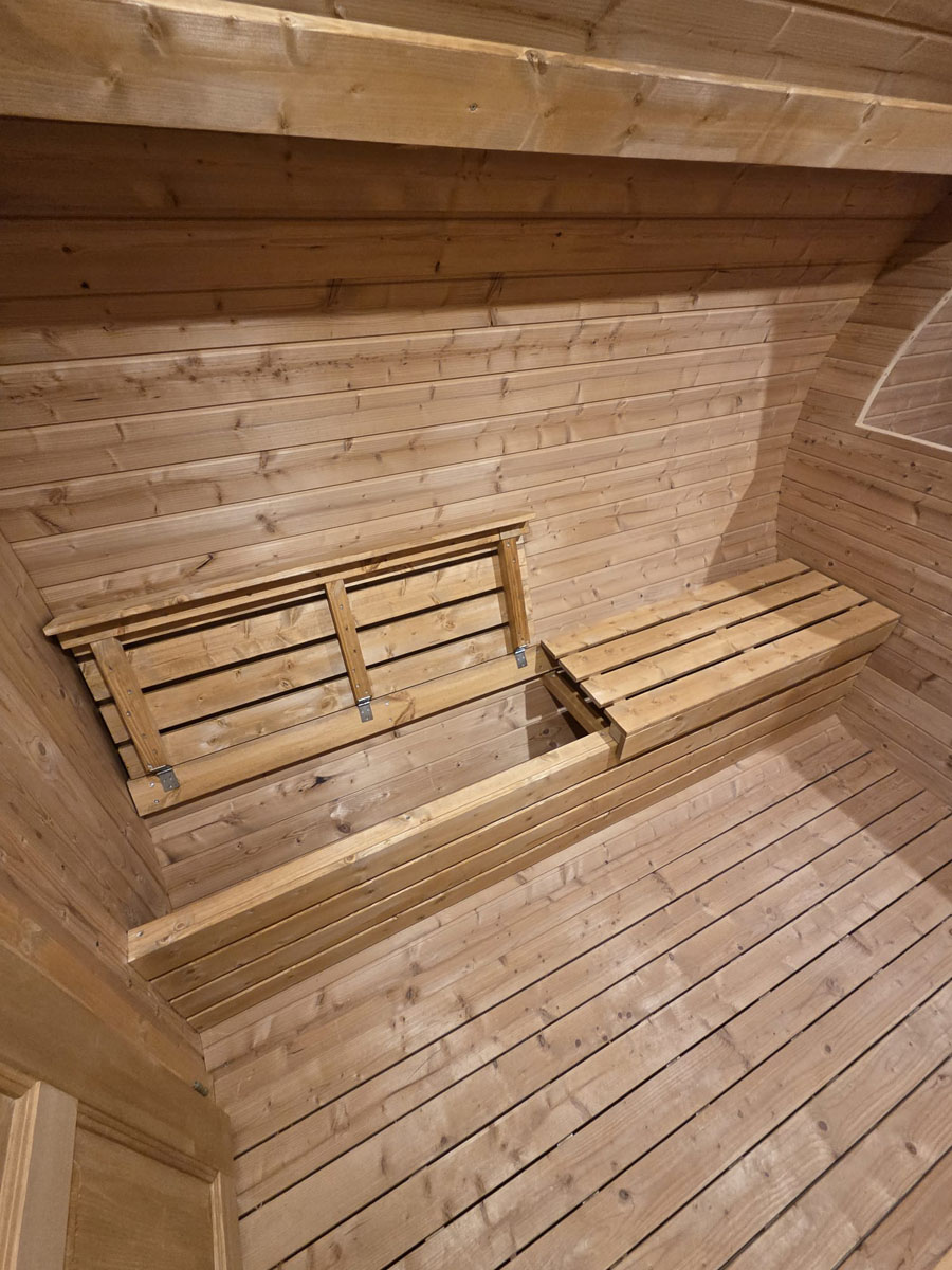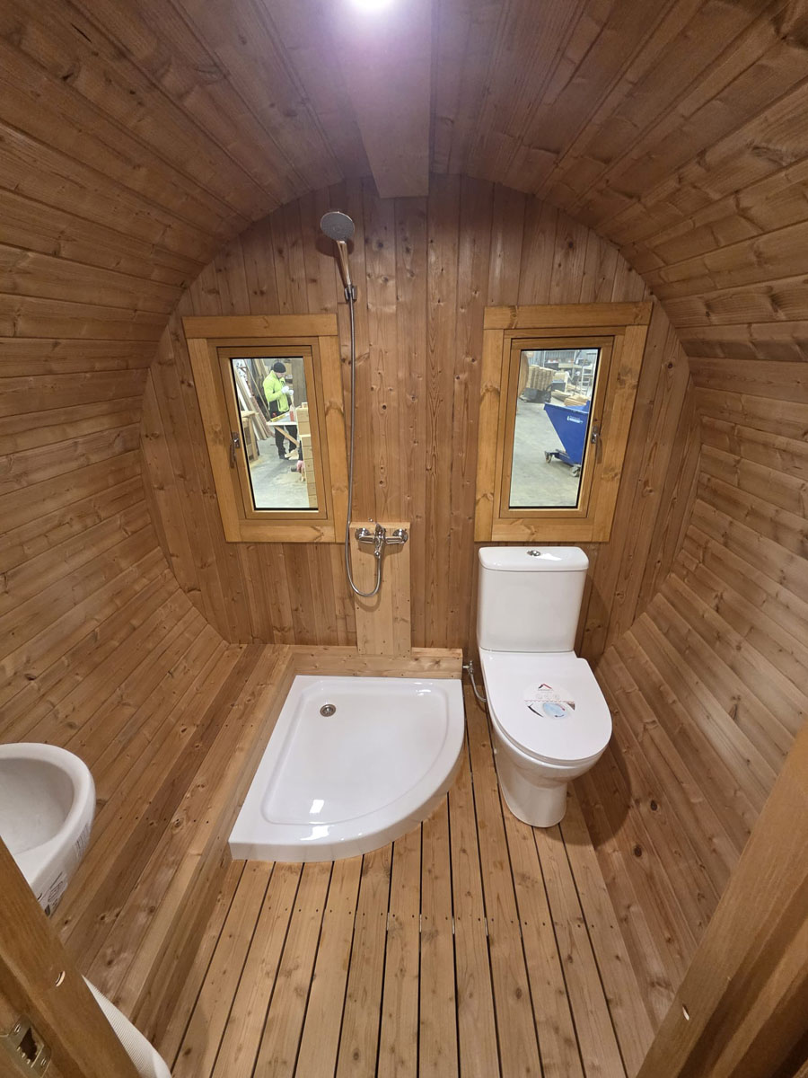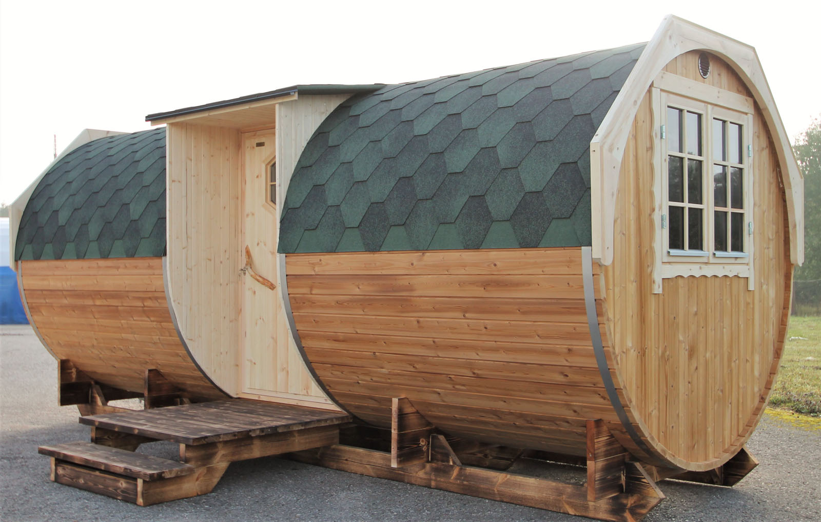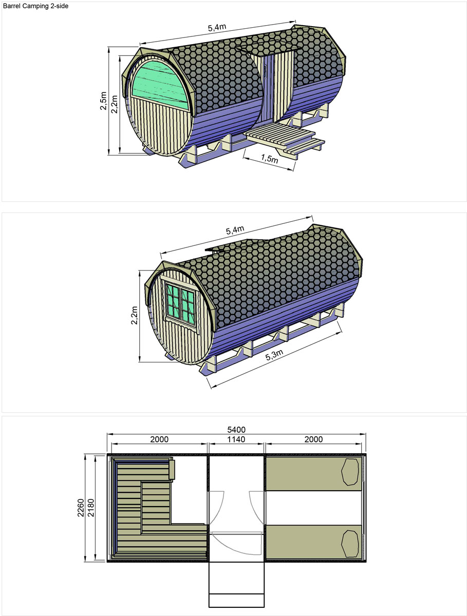 - The barrel is furnished with two fixed beds and kitchen room. There is also option to make one double-bed solution. Kitchen room may be replaced with bathroom with toilet and shower (with built in water heater).